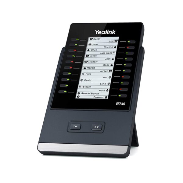 کنسول یالینک مدل EXP40 یک ماژول توسعه برای تلفن تحت شبکه مدل های T48S/ T46G/ T46Sو T48G می باشد که قابلیت عملکردی تلفن ویپ شما را به سطح کاملاً جدیدی گسترش می دهد. این کنسول یالینک دارای یک LCD گرافیکی بزرگ است. دو صفحه از 20 دکمه انعطاف پذیر روی صفحه نمایش نشان داده شده است که می توان تا 40 ویژگی مختلف را برنامه ریزی کرد، ویژگی های افزایش بهره وری شامل BLF/BLA، شماره گیری سریع، انتقال تماس، انتقال، پارک، پیکاپ و غیره است.
